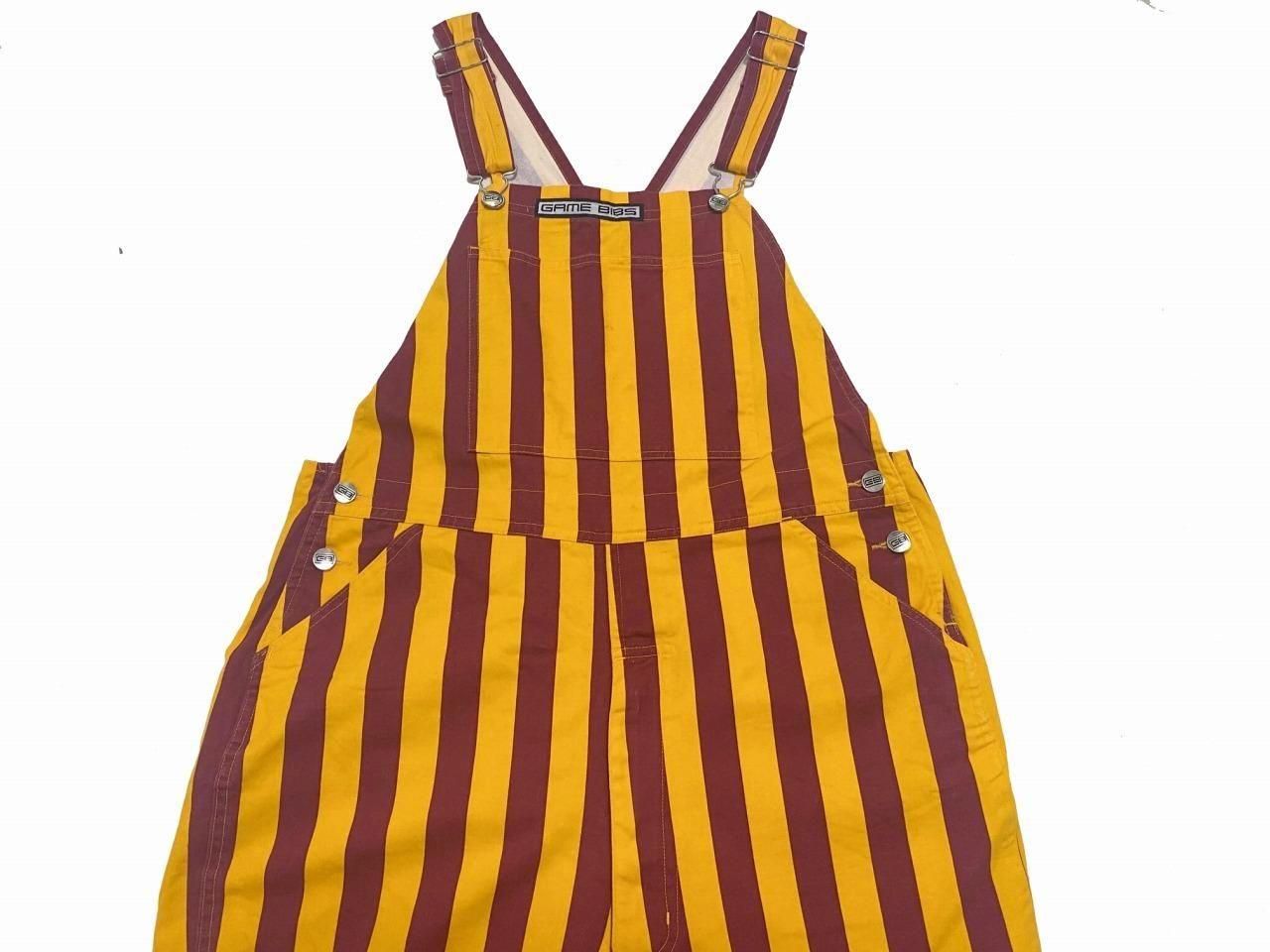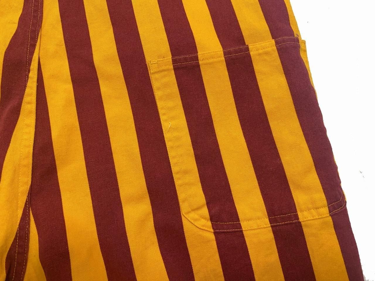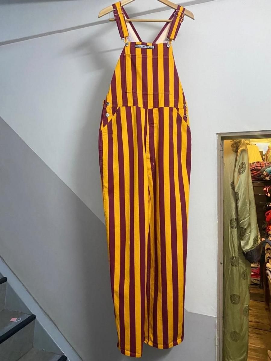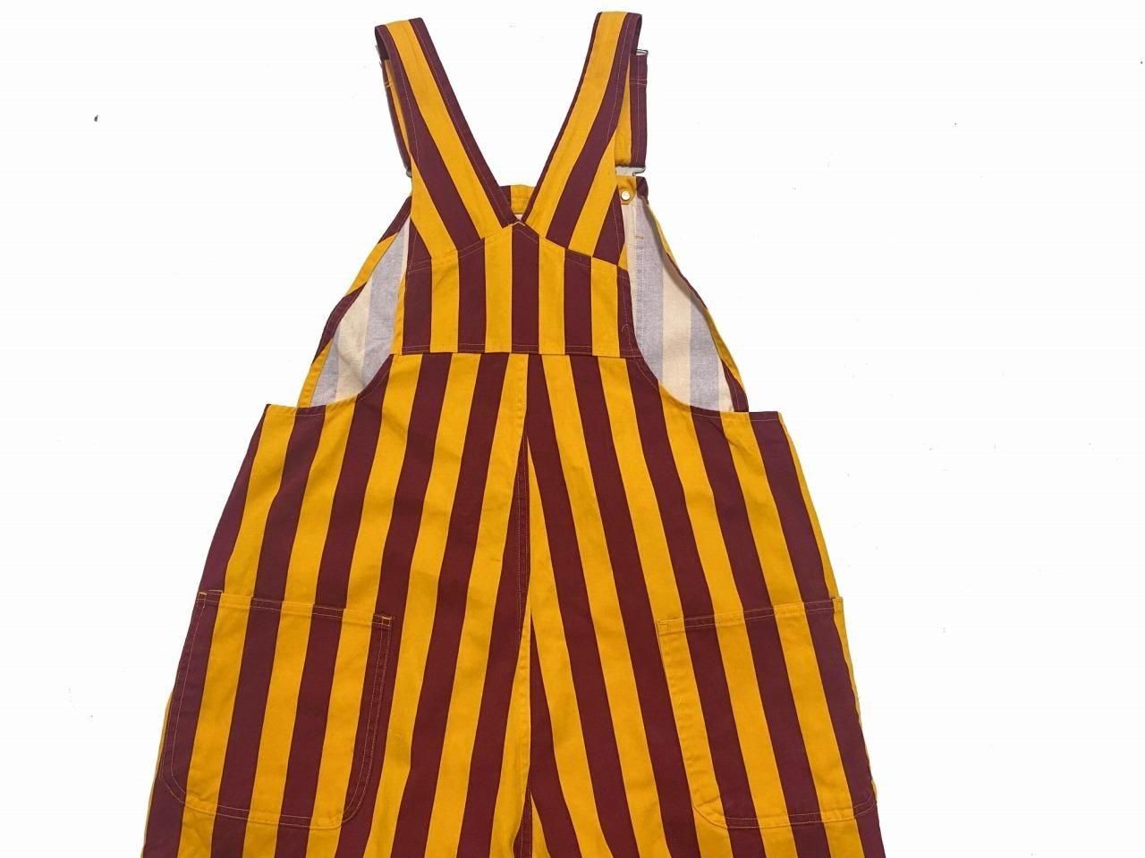 ブランド詳細不明ですが、黄色×エンジのストライプ柄のオーバーオールです。