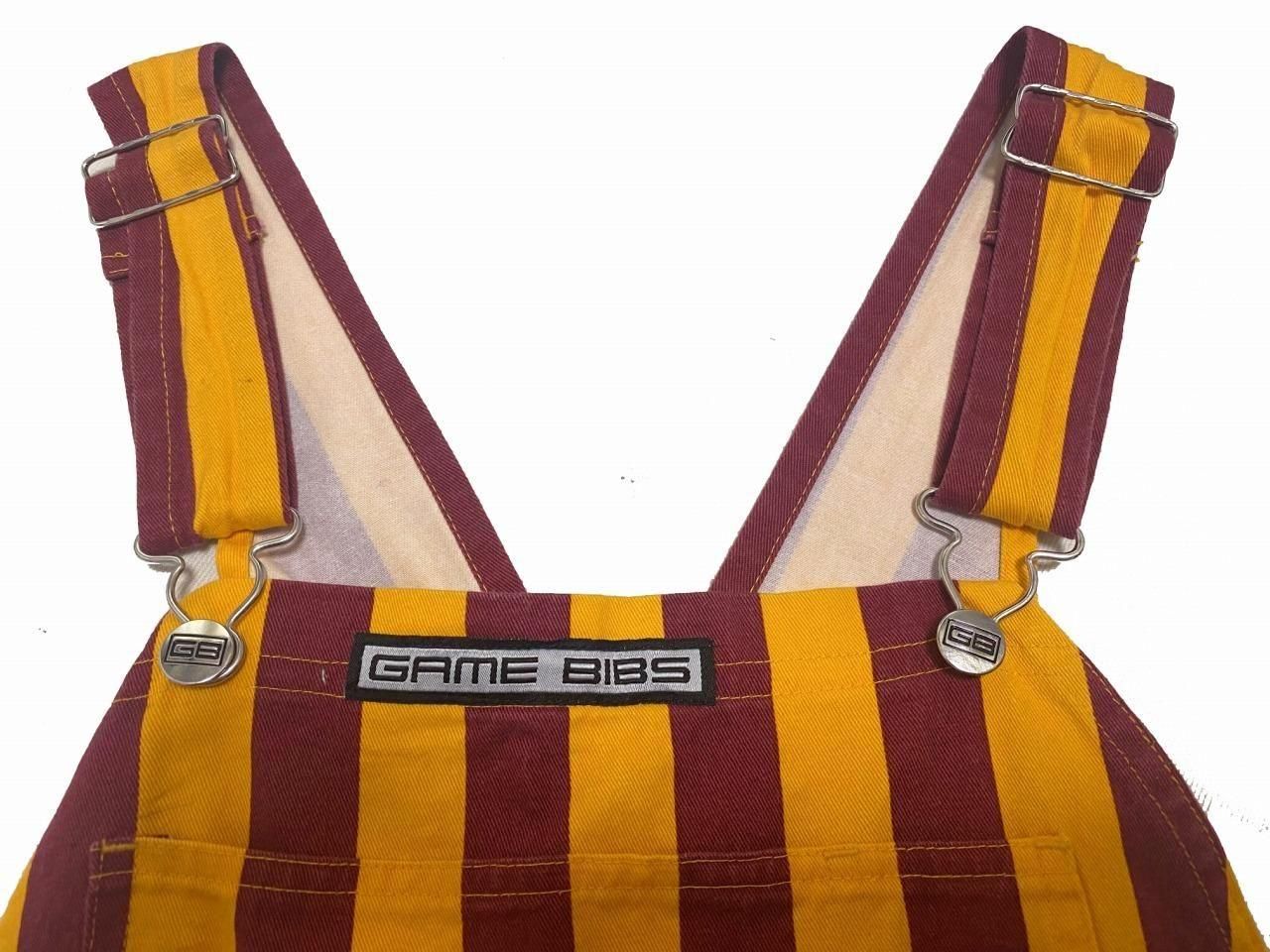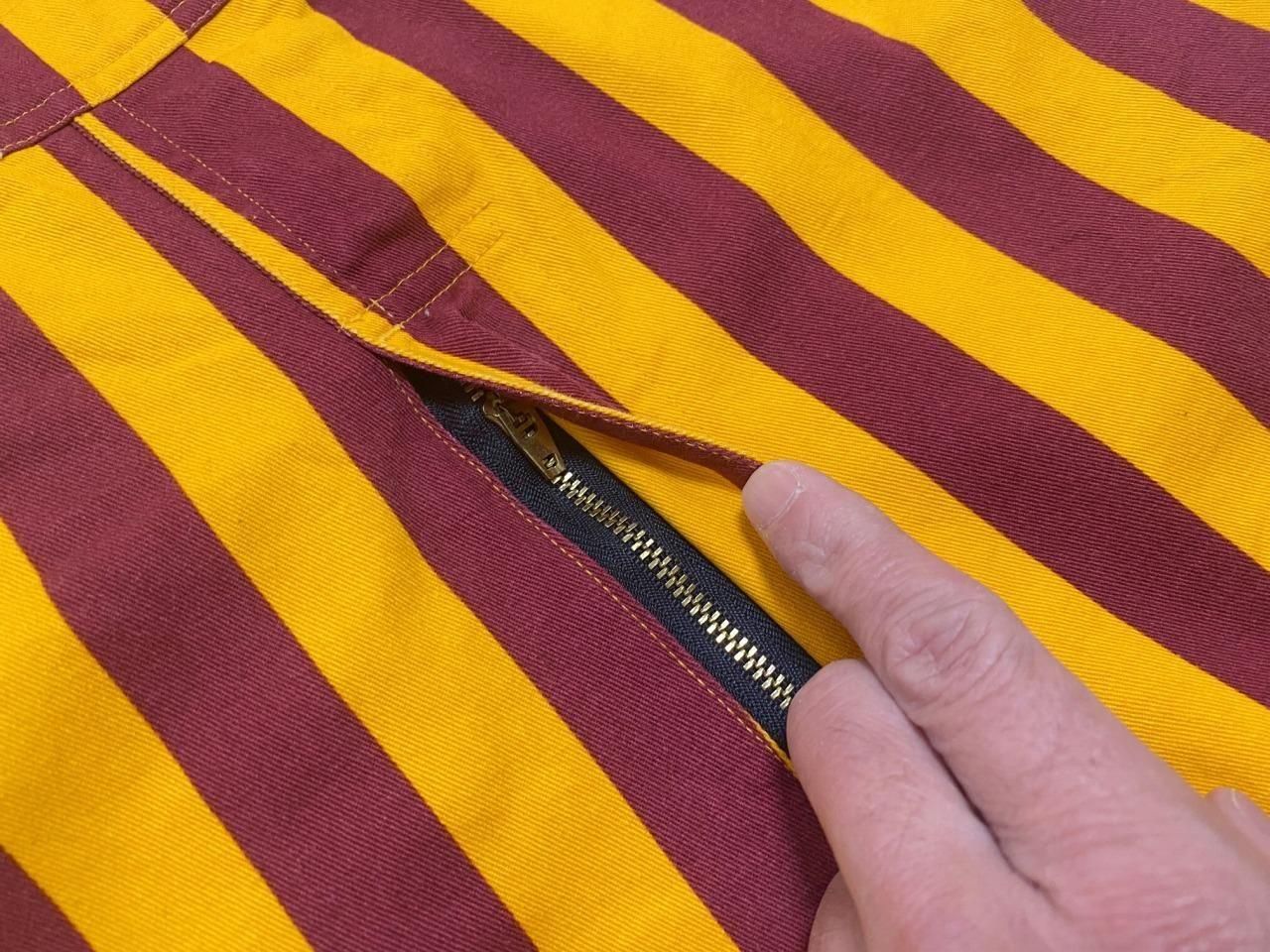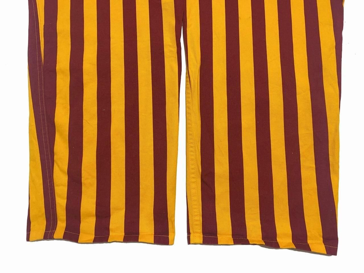 ブランド詳細不明ですが、黄色×エンジのストライプ柄のオーバーオールです。